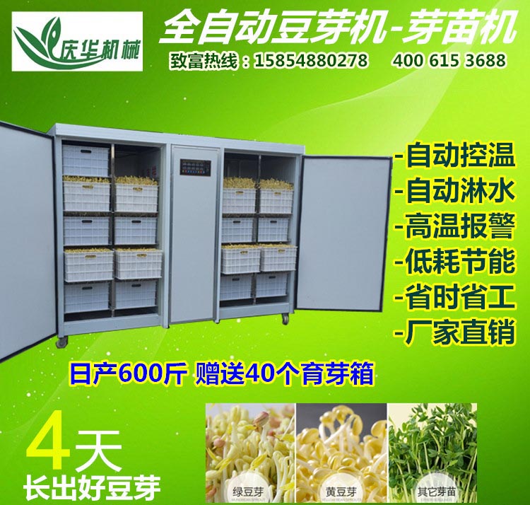 5、豆芽機產(chǎn)品特點: 1)我公司生產(chǎn)的全自動綠色無污染豆芽機,是現(xiàn)代技術(shù)與傳統(tǒng)工藝的結(jié)合。豆芽機通過微電腦自動控溫、自動加溫、自動顯示溫度、自動淋水,實現(xiàn)了生產(chǎn)過程的全自動化,具有省時、省工、低耗、無噪音等特點。 2)用我公司豆芽機生產(chǎn)的豆芽比傳統(tǒng)手工生產(chǎn)周期短質(zhì)量好,一般手工生產(chǎn)豆芽的周期,夏季需4-5天,冬季需要7-8天,而豆芽機生產(chǎn)豆芽只要3-4天即可,且不受地理環(huán)境、氣候條件和季節(jié)的影響。 3)我公司豆芽機生產(chǎn)的豆芽不僅種類多,而且產(chǎn)量高,一斤豆種可生產(chǎn)10斤左右的豆芽。且人工控制的環(huán)境下,豆芽生長均勻一致,潔白鮮嫩、清脆多汁,口感清爽;不僅食用安全、營養(yǎng)豐富,還具有一定的食療保健作用。 4)節(jié)省勞力,操作方便。將浸泡后的豆種放進豆芽機育芽箱內(nèi),就不用管了,它會自動加溫,自動淋水,經(jīng)過3-4天時間就可生產(chǎn)出潔白脆嫩的豆芽。 5)減少爛芽現(xiàn)象。豆芽生長的爛芽現(xiàn)象多發(fā)生在培育后的三天左右,由于手工生產(chǎn)豆芽的周期長,易出現(xiàn)爛芽現(xiàn)象,然而采用豆芽機生產(chǎn),三天左右豆芽已經(jīng)成熟,可以采收食用,不會有爛芽現(xiàn)象發(fā)生。